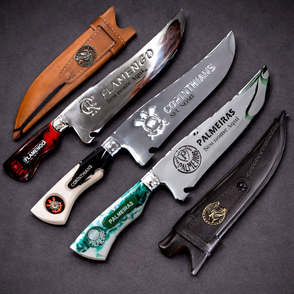 Possui cabo ergonômico, garantindo pegada firme e segura mesmo com mãos molhadas ou engorduradas. Produção artesanal, com acabamento polido e testado para alto desempenho.