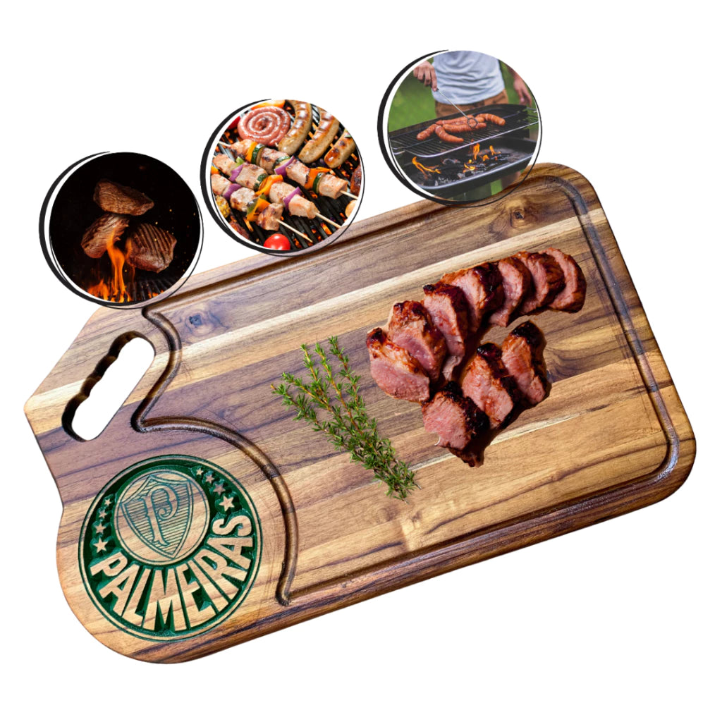 Transforme cada churrasco em um momento único com nossa Tábua de Churrasco Personalizada em Madeira Nobre Teca. Com medidas generosas de 49x29x2cm, ela é perfeita para cortes grandes, preparo e apresentação das carnes de forma elegante.