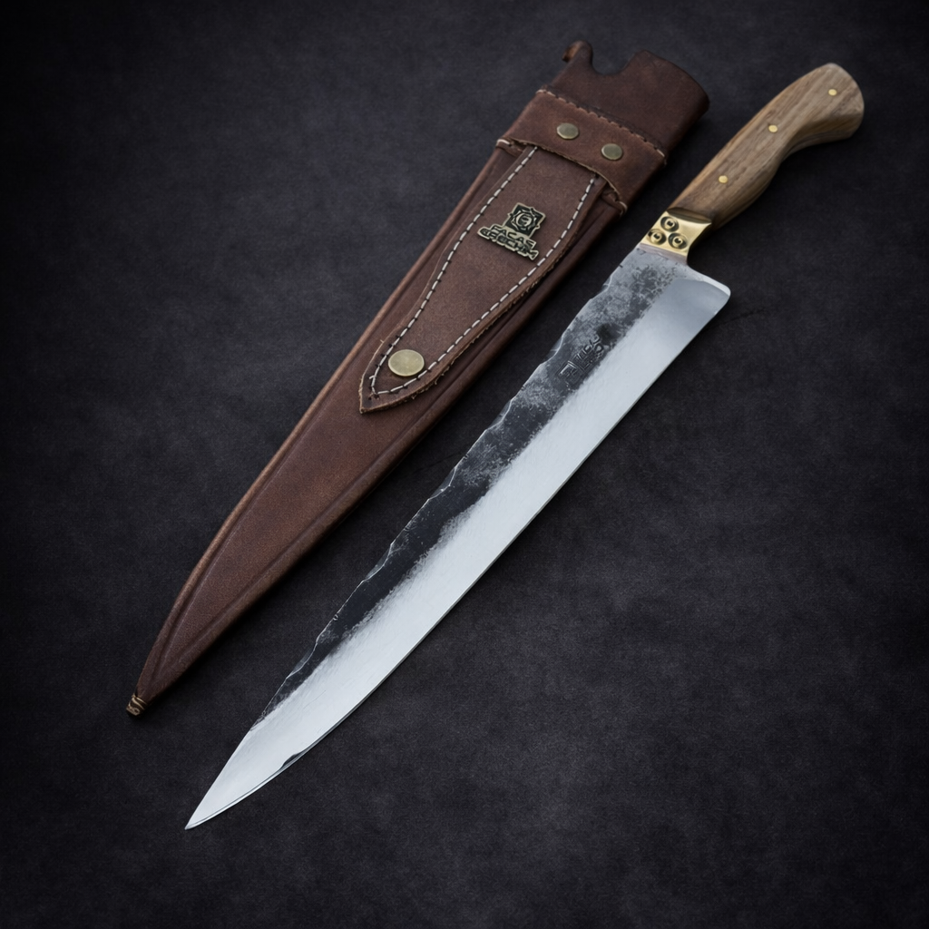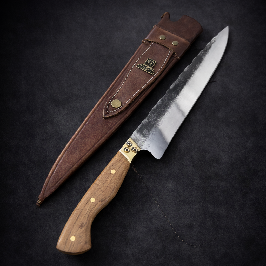 Seu design Full Tang garante equilíbrio, resistência e segurança durante o uso, enquanto o cabo em madeira guajuvira com pinos em bronze entrega firmeza na pegada e acabamento sofisticado.